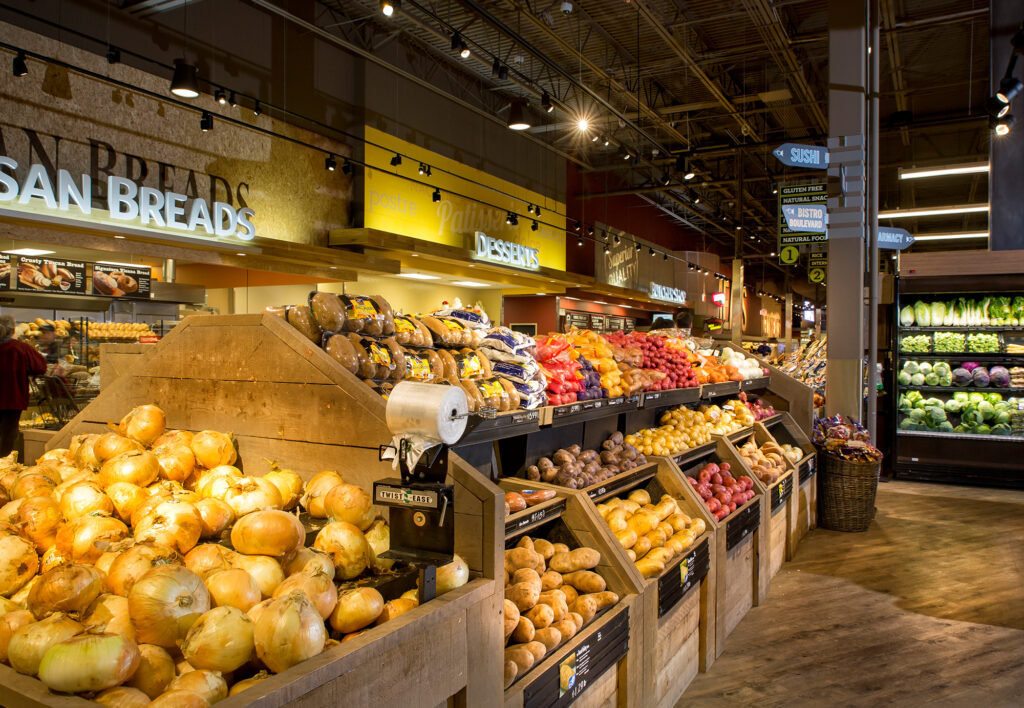The formula to both parts of the equation is the right lighting. Good retail lighting moves merchandise and directs shoppers with effective wayfinding. The right lighting will guide customers through the store to the bright fresh and prepared food sections where theatrical lighting puts the spotlight on produce, meat, seafood and prepared foods.