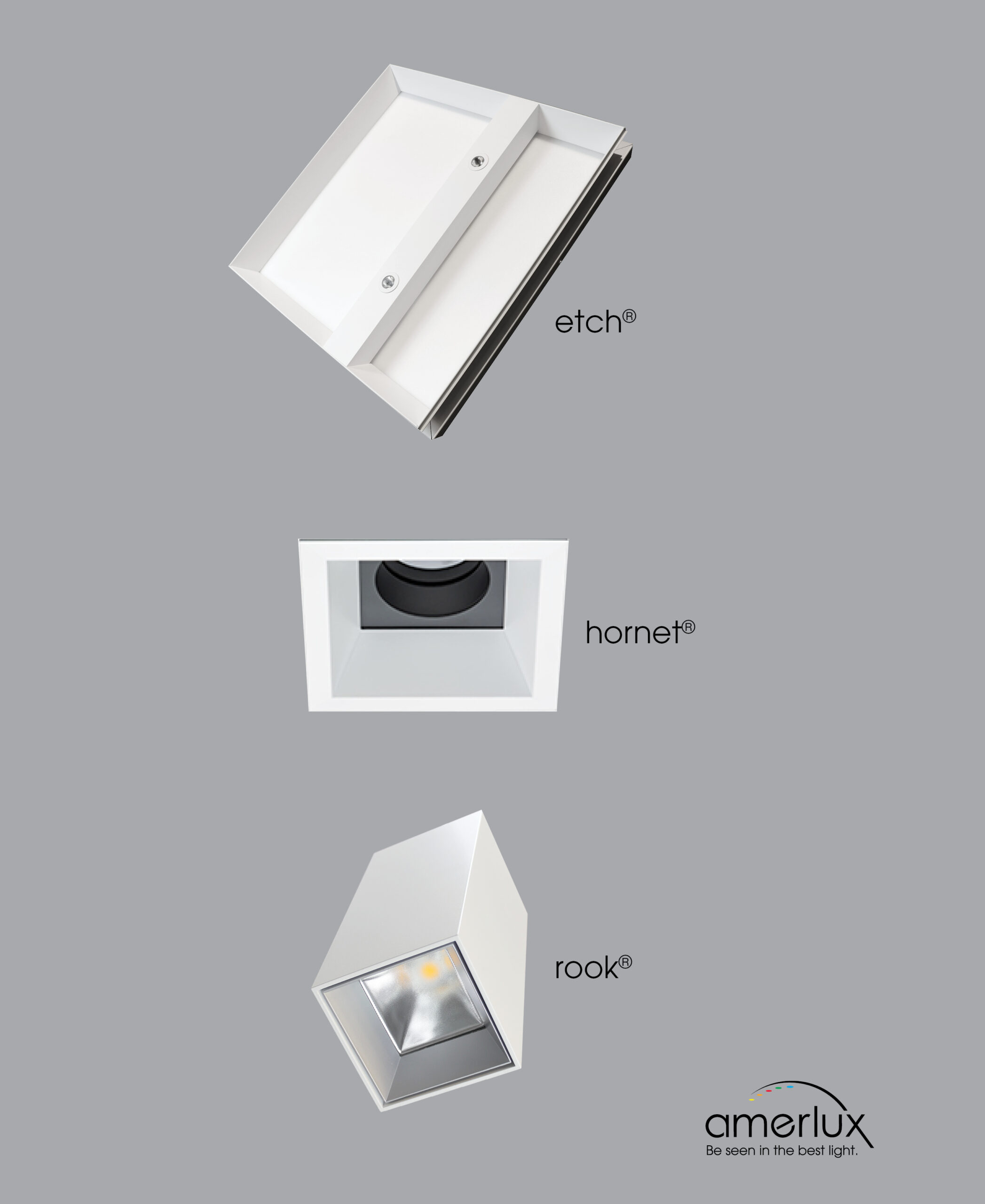 At LightFair 2019, Amerlux will feature three products that are part of the first wave of PoE: Rook, Etch and Hornet HP downlights.
