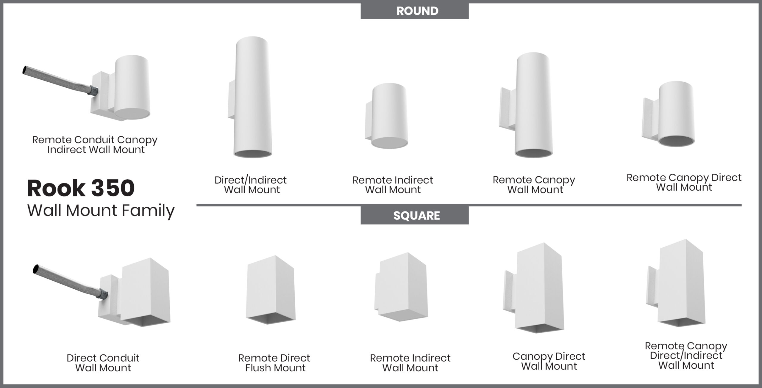 No matter the shape, Rook 350 offers several mounting options: wall mount, canopy wall mount, conduit canopy wall mount, remote wall mount, remote canopy wall mount and remote conduit canopy wall mount. The square flush mount option is a perfect solution for ADA compliance.